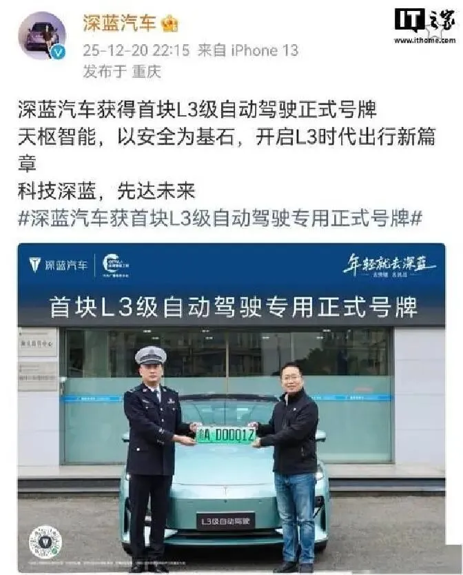 为啥现在能上牌?因为工信部12月15日刚批了首批L3车型。长安和极狐的车,一个专治城市堵,一个专攻高速。重庆更绝,12月20日发了第一块L3号牌“渝AD0001Z”给长安。人家测试跑500万公里,重庆的山路弯得比火锅底料还乱,系统愣是没崩过。长安的工程师跟我吐槽:“试车员都累出黑眼圈,但车稳得像老司机。”
