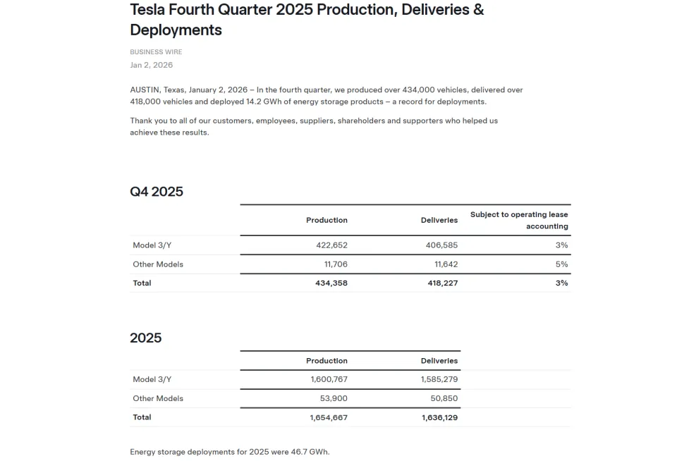 作为最新数据中的唯一亮点,特斯拉表示在第四季度部署了14.2吉瓦时的储能产品,刷新了前一季度12.5吉瓦时的历史前高。特斯拉的电池储能业务包括家庭储能系统,以及供数据中心和公用事业部门配套使用的大型系统。特斯拉在2025年全年共部署了46.7吉瓦时产品,2024年为31.4吉瓦时。