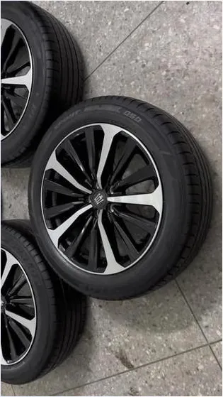 然后.我们看一.下轮毂,20寸的铝合金轮圈,黑化处理,造型还可以,就是那种多辐的设计。我用指.甲敲一下,做工还行,没.有什么毛刺。但是这个.轮圈,我觉得样式稍微有点保.守,要是能再激进一点就好了,毕竟都溜背造型了对吧。