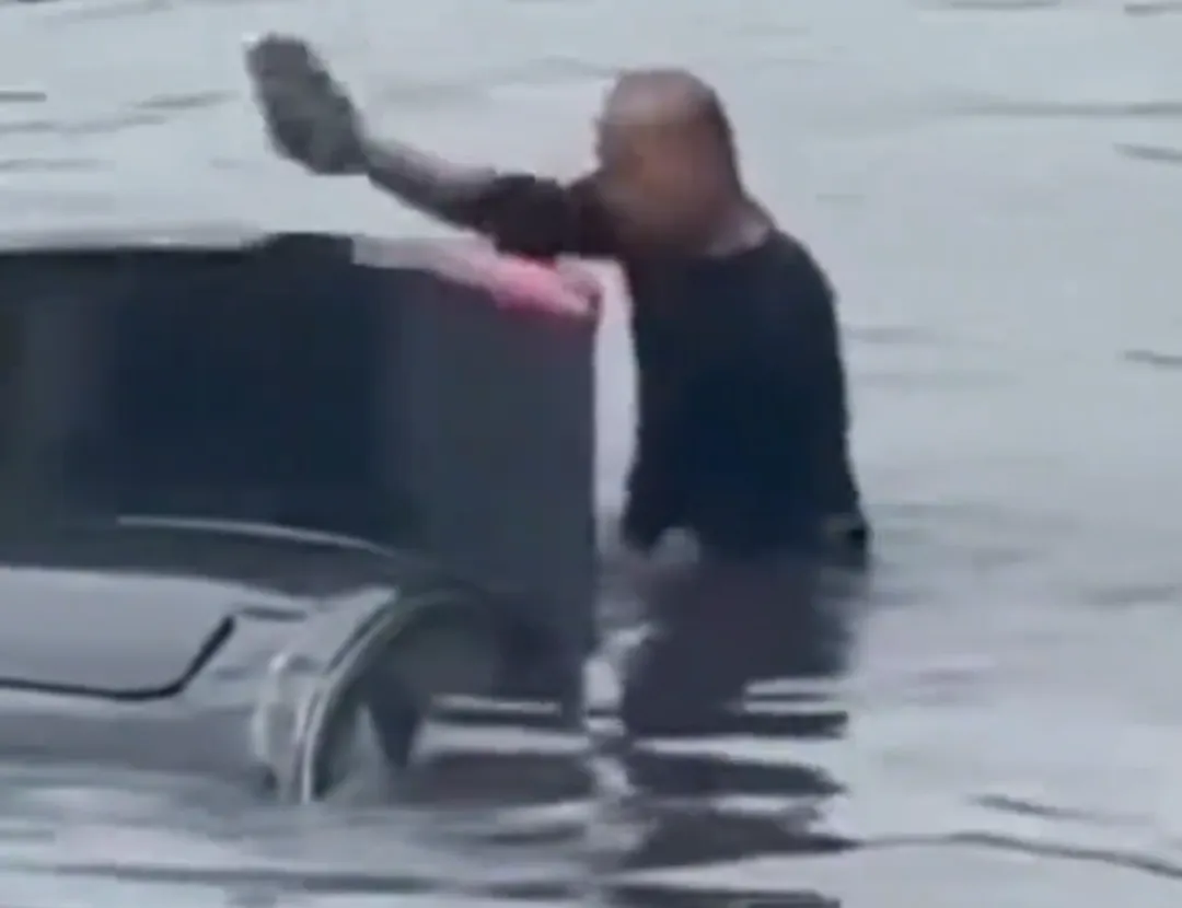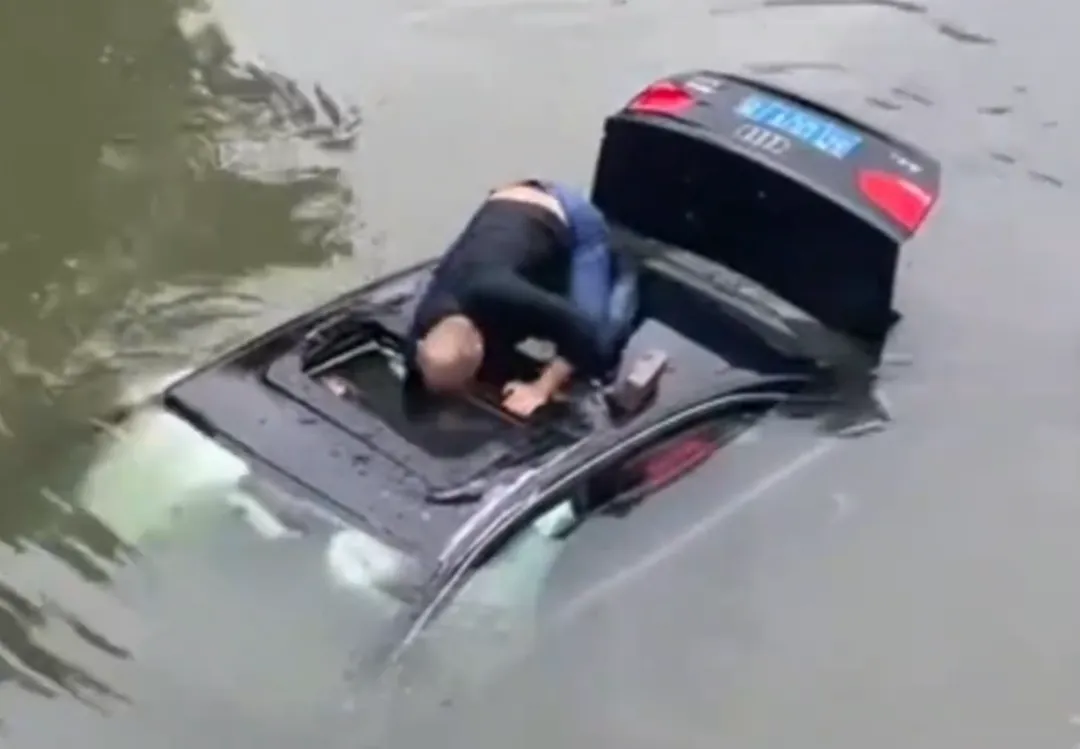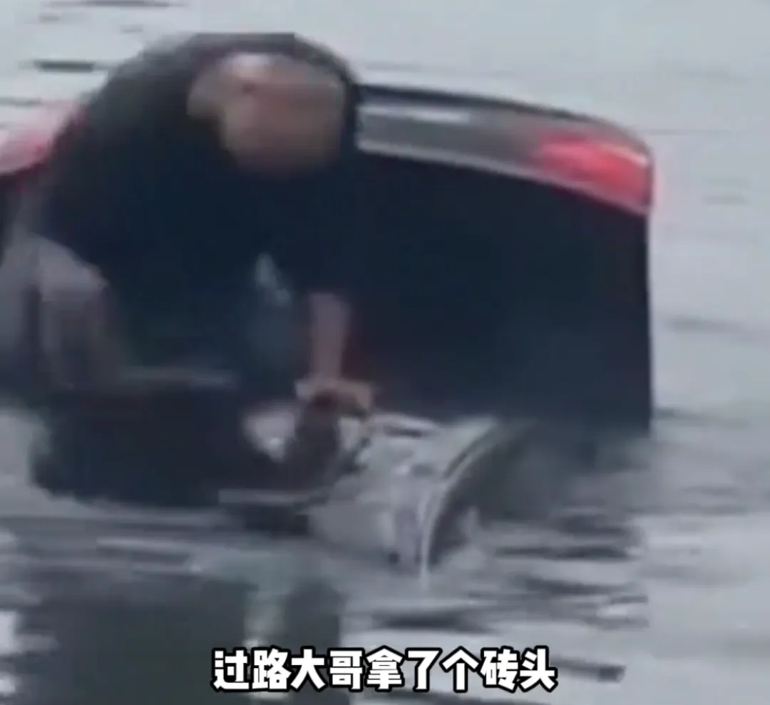 关键时刻,一名黑衣大哥找到一块砖头,直接跳河向沉水轿车游去。他爬上湿滑的车顶,用砖头连续砸向天窗,玻璃碎裂刺伤了他的手臂,他却丝毫没有停下。