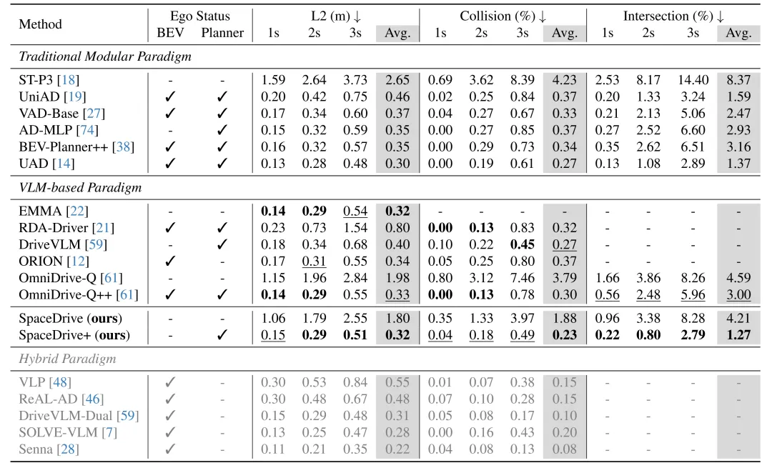 SpaceDrive+的平均轨迹误差仅0.32米,碰撞率0.23%,道路交叉率1.27%。对比同类VLM方法,OmniDrive-Q++的平均误差是0.33米、碰撞率0.30%,ORION的平均误差0.34米、碰撞率0.37%,SpaceDrive+在精度和安全性上都更优;即便是混合了传统模块的方法,SpaceDrive+的表现也毫不逊色。