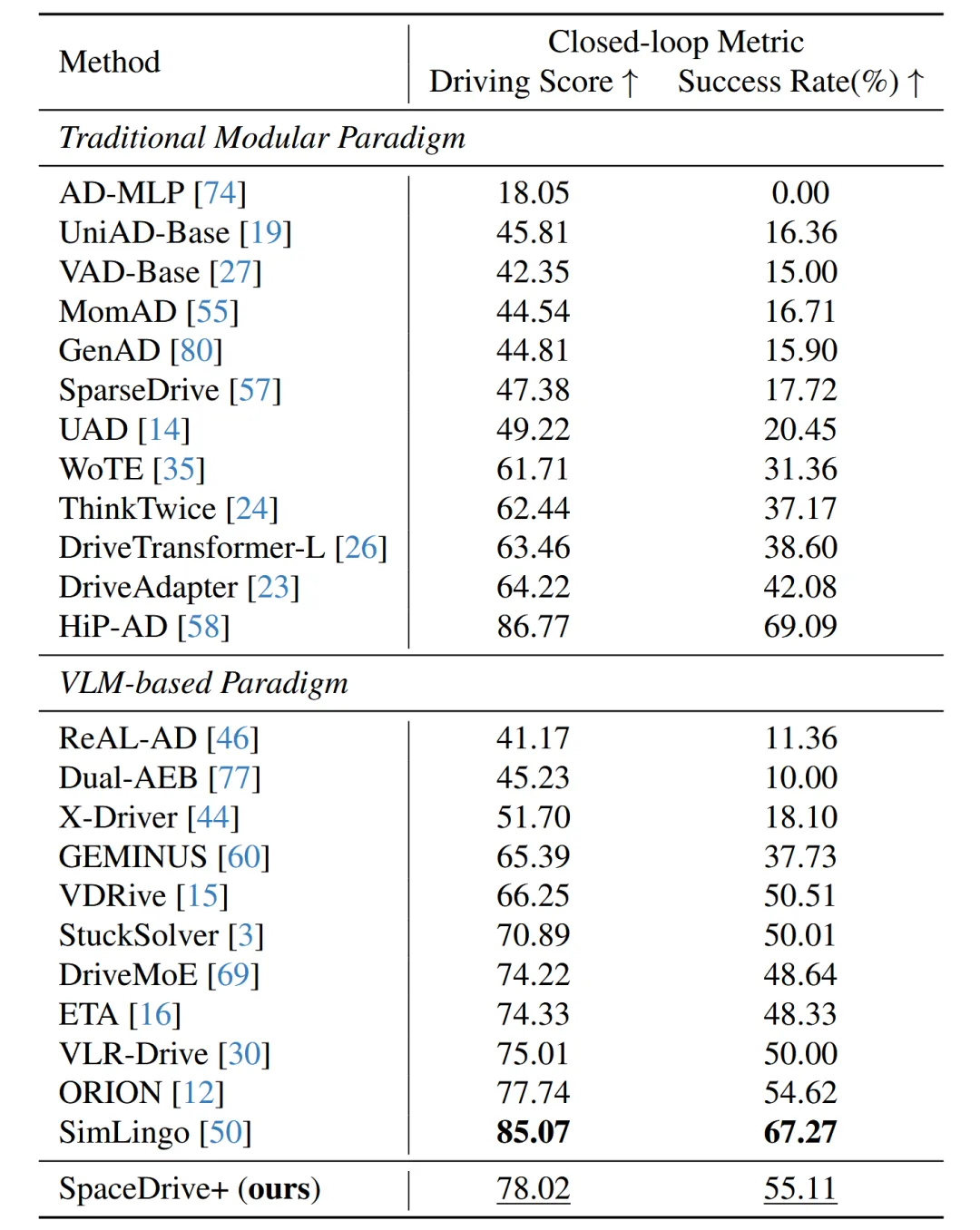 在包含220条路线、44种交互场景的闭环测试中,SpaceDrive+的驾驶分数达到78.02,任务成功率55.11%。在所有纯VLM方法里排名第二,仅次于SimLingo;对比传统的端到端模型,比如VAD-Base(驾驶分数42.35、成功率15.00%),优势非常明显,能在复杂交互场景中做出合理决策。