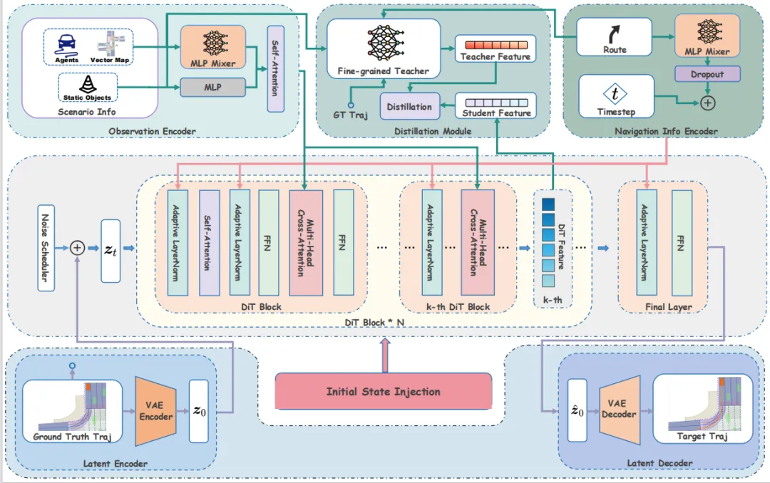 总损失为 。这可以为学生模型的中间层特征提供一个已经编码完美(良好的规划–场景交互与对齐)的“模板”,从而降低学生模型中规划空间与向量化输入空间的交互“难度”,引导更好的特征融合。由于已经有工作证实:像素扩散模型自身就是很好的 image-condition 对齐编码器,因此我们直接使用像素空间规划器 Diffusion Planner 作为教师模型。