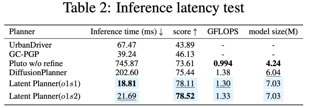 - 推理速度: 如表2所示,相比于之前的 SOTA 方法 Diffusion Planner(需迭代 10 步),LAP 受益于潜在空间的紧凑性,仅需 2 步 采样即可生成高质量轨迹,实现了最高 10 倍 的推理加速。