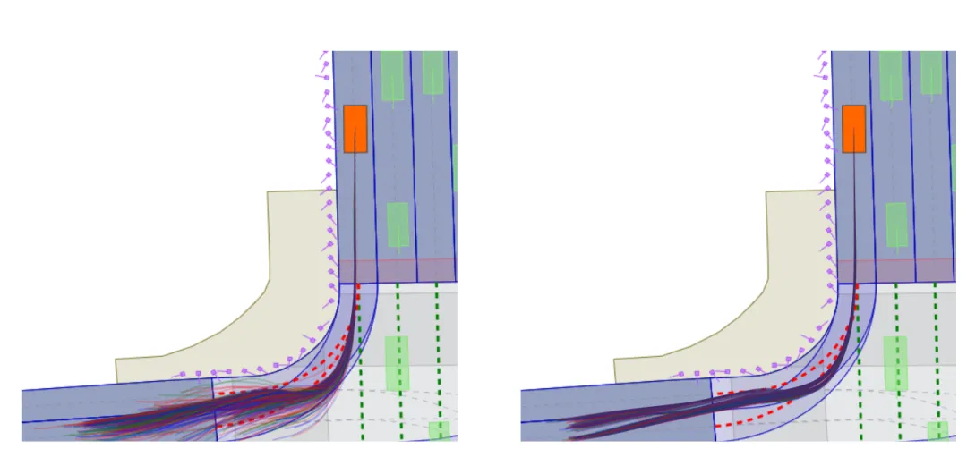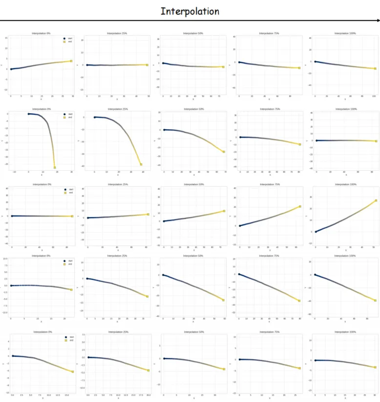 图 4:多模态轨迹解码,左图为Latent Planner,右图为Diffusion Planner,Latent Planner表现出更高的多模态驾驶策略- 插值: 潜在空间的线性插值能产生平滑的轨迹过渡,证明了潜在空间的光滑性(参见下图)。