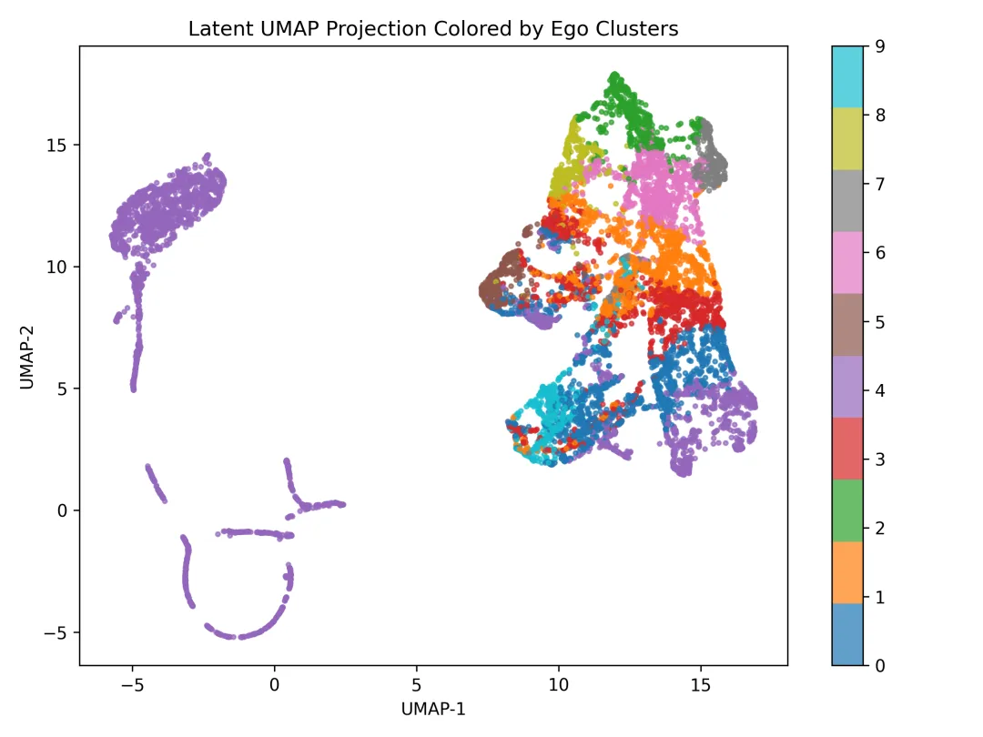 图 6:潜在空间聚类- 降维可视化: 在原始轨迹空间聚类得到“意图”标签,随后用 UMAP 对潜在空间降维并用对应意图染色,结果显示不同区域基本分离开,说明潜在空间结构与意图对齐良好(参见下图)。