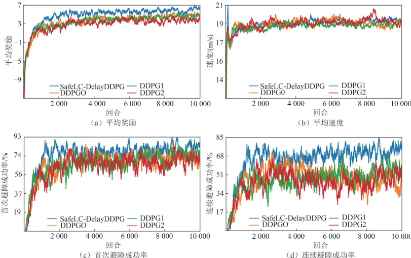 1)相较于基线算法,SafeLC-DelayDDPG算法能够在训练阶段最多提高首次避障成功率17.9%、连续避障成功率60.5%,证明了提出算法能够显著提升自车在复杂交通场景下的感知与决策能力,通过将局部观测、车道语义信息和自车全局状态有效融合的状态空间设计有效增强了环境感知与风险敏感性,在提升任务完成度和避障效率方面具备有效性。