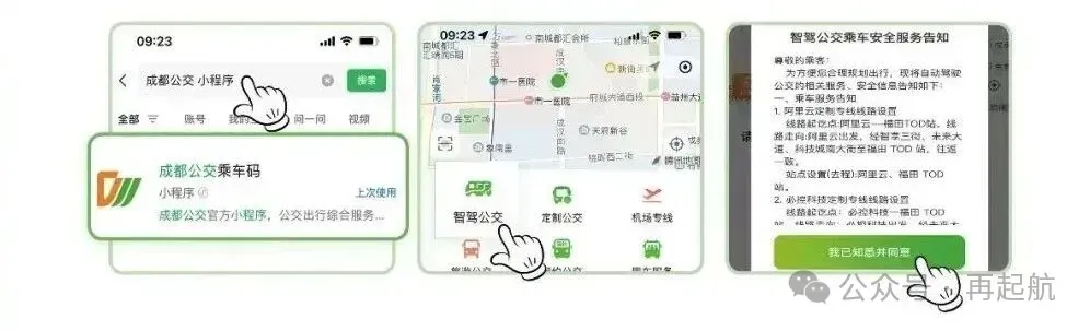 搜索打开成都公交小程序,进入"出行"页面→点击【智驾公交】→阅读后勾选同意《安全服务告知》。