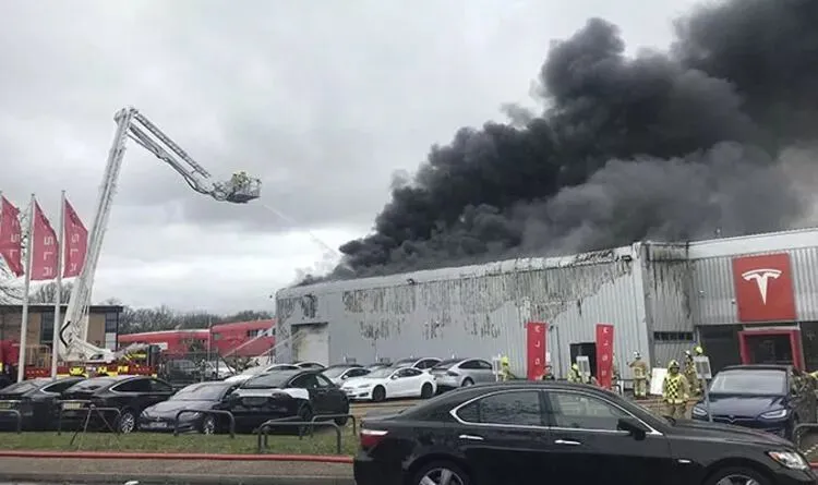 英国克劳利,一家特斯拉车行起火及爆炸,有目击者称是电池自燃引起。图/Daily Express