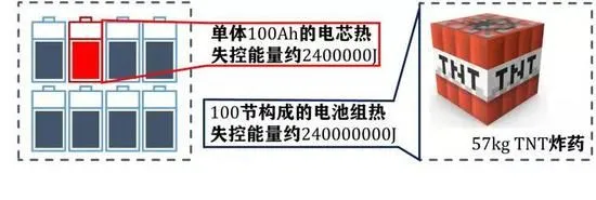 据2030出行研究室报道:“由100节带电量100Ah的电芯组成的电池组,失控能量达到240000000J,约合57公斤TNT炸药。”
