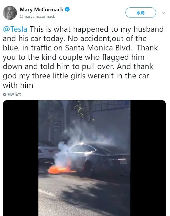 去年6月,美国女演员Mary McCormack在网上发布视频,称其丈夫的特斯拉在街头停车时无故自燃,幸好当时她丈夫和三个女儿并不在车上。