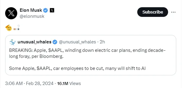 特斯拉首席执行官埃隆·马斯克(Elon Musk)也在社交媒体网站X上发文,对苹果公司的决定表示祝贺。他发布了一篇帖子,上面配有一个致敬的表情符号和一支香烟。