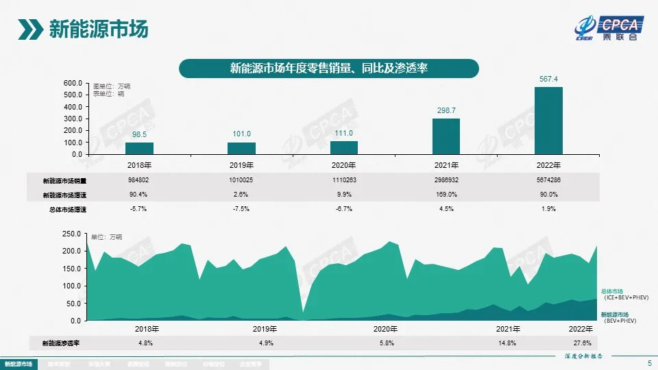 根据乘用车市场信息联席会提供的数据,2022年中国新能源汽车总交付量约为567.42万辆,在汽车市场大盘中渗透率为27.6%。相当于,在2022年中国每售出的4辆汽车中,就有超过1辆是新能源汽车。