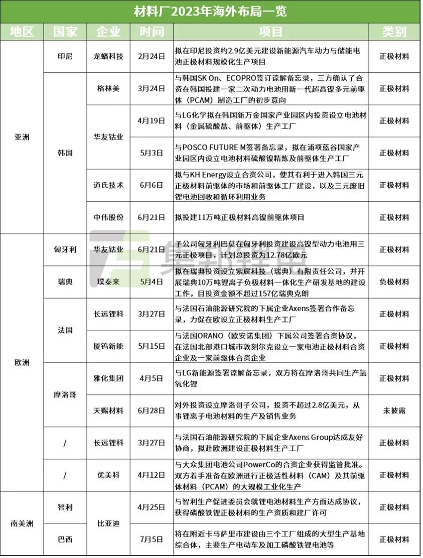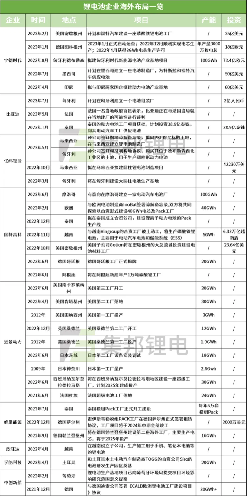 在这张表里,工厂产能的单位是GWh,也叫“吉瓦时”,也就是100万千瓦时,100万度电。按一辆车电池包70度电来计算,1GWh的电池产量足够装上1.4万辆车,所以10Gwh的电池工厂是一个很大的产量规模。有人说,这是“叛国”吗?明明自己的产业这么大优势,还要往老外身上贴贴?美国建厂用人成本多高、供应链成本多高、脱钩风险多大,心里没点数吗?不要随随便便给别人扣帽子,也不要低估中国企业家计算风险的能力。在当前的国际大背景下,怎么理解中国新能源企业出海建厂的这件事?2022年,中国锂电池出口达到了3427亿元,相比2021年的1835亿元增长86.7%;今年上半年,锂电池出口又增长了近70%,超过2000亿元。那就一直出口就好了,为什么要去别的国家建电池厂呢?几个原因:电动车企普遍希望电池厂离得近一些,就像中国车企都希望在方圆几十上百公里完成零部件配套一样。而这些西方传统的汽车大国,为了扶持新能源汽车产业发展,又祭出了各种本地制造的补贴政策,只要满足一定标准,这羊毛不薅白不薅。比如美国,拜登政府要求,从2023年开始,电动车必须有50%以上的电池部件和材料在北美制造或组装,才能有资格得到3750美元/辆的税收优惠,到2029年这一比例要达到100%。对于中国上游电池厂家来说,在碳关税、贸易审查等壁垒的障碍下,如果能给海外客户直接在当地做配套,也可能在绕过壁垒方面提供一些便利。国轩高科工研总院常务副院长徐兴无就透露过,大众在欧洲的车必须装配欧洲生产的电池。比如波兰这样的国家,在我们分析制造业的时候经常忽略它。事实上,欧盟出口的每2辆电动公交,就有1辆是在波兰制造的。当地不仅给企业提供了低税率、补贴,而且相比于西欧国家用工成本更低,当地工业化程度比较高,产业基础较好,又是一带一路沿线国家,中欧班列货运十分方便。所以波兰很受中国新能源企业的青睐。新能源产业寻觅着各种适合自己的基础设施、产业条件,而这个过程在一个个后发国家悄然落地、生根、发芽,正在一点点悄然改变着全球制造业的地缘格局,重塑着很多“新优势”国家的经济命脉。也正是因为这些国家对新产业的旺盛需求,吸引了中国整车企业出海,结果又带动了一批国内配套企业一起出海。那么把电池厂看成下游的话,设备厂和材料厂就是上游。比如均普智能,做电池模组产线的,就给墨西哥的福特、越南的VinFast定制产线。锂电池隔膜企业恩捷股份在匈牙利的生产线已经开动,另一家隔膜企业星源材质要在马来西亚投资建厂。负极材料龙头璞泰来计划在瑞典建设10万吨一体化生产研发基地。铜箔企业海亮股份相中了印尼,诺德股份看中了比利时。当然风险不是没有,一旦出现一些比较极端的局势,不排除外国政府干出把中方赶回老家、没收当地资产、强行退出持股份额等操作。就在前不久,美国众议院就宣布要对福特与宁德时代35亿美元的电池合作项目进行质询。新增了2500个工作机会,但高收入工作会给中国人而不是美国人;(实际上宁德时代的技术专家不算在2500个岗位中)中国员工会在福特工厂待到2038年,所以福特要长期依赖中国人;福特用了中国的技术和原材料,可能不会促进美国电池技术进步,(实际上宁德时代会向福特进行有偿技术许可)等等。众议院的调查委员会要求福特提供与宁德时代的授权合同副本、与宁德时代的所有通信往来、与拜登总统有关宁德时代的所有通信往来,要对合作进行详细调查。“福特说:我需要宁德时代啊;美国说:不,你不需要。”所以说,我们要努力开创的“新全球化”“再全球化”就是步履维艰的。我们在很多产业当中,现阶段还是一个总供给远大于国内总需求的情况。今年国内动力电池已经出现供大于求,连宁德时代上半年产能利用率都只有60.5%,创下了新低。一些过去加班的电池厂,今年开始双休、8小时工作制。化解国内过剩产能,有效的出路就是出海去,不只是像过去那样,只是销售端出海,而是现在全方位地制造端出海加融资端出海。多家企业已经正式登陆瑞交所并成功发行GDR(全球存托凭证)根据SNEResearch的数据,2023年第一季度,全球动力电池装机量133GWh,而TOP 10当中6家头部中国企业的市占率就达到60.9%。但是很多中企都是把电池装在中国的车上,到了海外就是另一番光景了。2023年海外一季度市占率前十的动力电池企业中,中国企业有5家,市占率只有29.6%。LG、松下、SK、三星……这些都是我们在海外战场上正面交锋的对手。所以海外电池市场这个蛋糕足够大。根据德国机械设备制造业协会统计,2019年至2030年,新能源汽车电驱、电力电子、汽车电子、动力电池等核心部件的全球市场规模会超过3万亿元人民币。但是如果我们一直在本土搞定新能源汽车全产业链,一辆电动车70%、80%、90%的增加值都被我们独吞,然后大规模出口整车挣外汇,把别人家油车、电动车产业都打趴下,在未来的汽车行业积累超高的贸易顺差,这种情况是不可能长久的。即便我们上下游再强大,我们也不能把肉吃了、把汤喝了,连个骨头渣滓都不给人剩,这样一定会遭受到恶劣反扑。我们电动车产业积累有先发优势,有产业集群优势,但是也要给别人的整车厂、电池厂、材料厂、设备厂留出一定的生存空间来,同时对合理范围内的产业竞争保持高度的清醒和亢奋状态。那管控竞争,甚至可以说“监控”这种全球竞争,最好的一种方式,