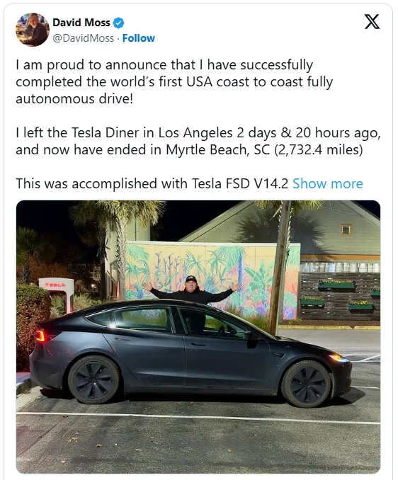 近日,塔科马市居民大卫·莫斯(David Moss)在社交平台X上发布的系列动态火遍全球。他宣布,自己成功驾驶特斯拉完成了世界首次完全自动驾驶横跨美国之旅,并正式载入汽车工业史册。