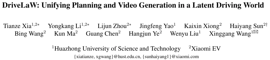 华中科技大学与小米汽车联合提出的 DriveLaW 方案,彻底打破了这一壁垒。它将视频生成与轨迹规划统一在同一个 latent 空间,让规划模块直接“读懂”视频生成的场景语义,实现高保真场景预测与可靠轨迹规划的天生一致性,在两大核心任务上均创下 SOTA 性能。