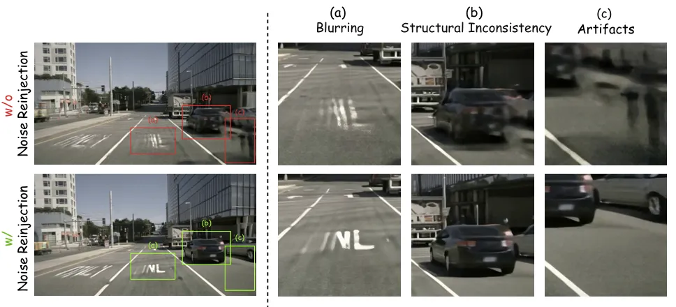 高速行驶时,长距离运动易导致视频模糊、物体结构不一致、出现伪影(如图3所示)。DriveLaW-Video 针对性设计噪声重注入机制: