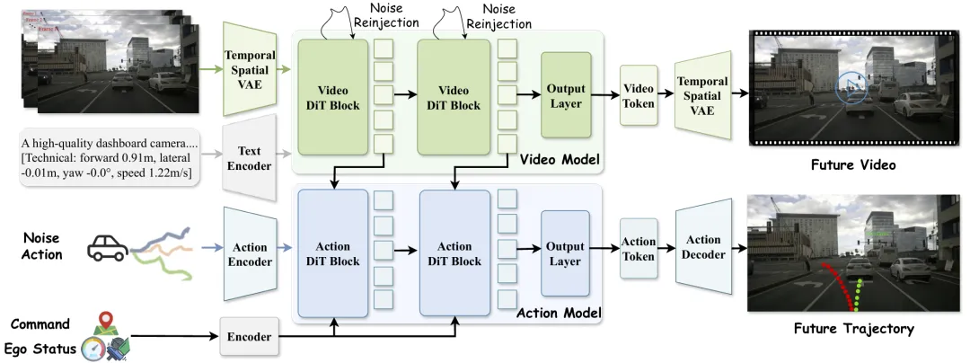 动作编码:将带噪声的动作 编码为 ;上下文编码:将 ego 车辆状态(速度、姿态)和高层指令(直行、转弯)编码为; 视频 latent 注入:缓存 Video-DiT 第一阶段去噪的所有 Transformer 块特征 ,作为规划器的交叉注意力条件。