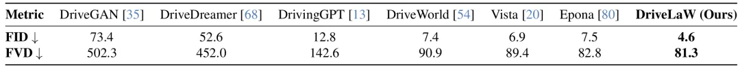 在 nuScenes 单视角视频生成任务中,DriveLaW 以显著优势超越所有基线方法,FID 降低 33.3%,FVD 降低 1.8%: