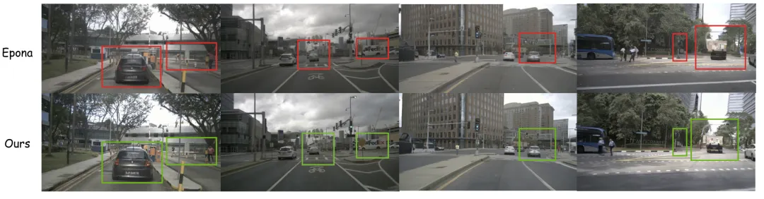 定性效果上,与SOTA方法 Epona 相比,DriveLaW 生成的视频:①车辆细节更清晰、结构更稳定;②行人形状完整可识别;③不易察觉的物体(如黄色货车)能准确还原位置和外观(如图4所示)。