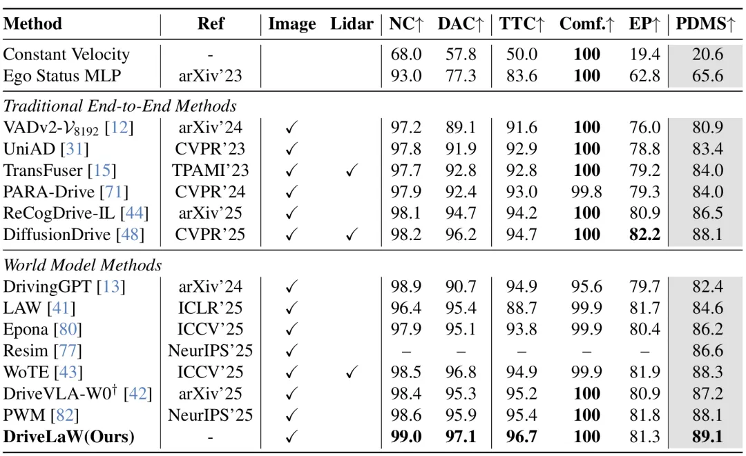 在 NAVSIM 闭环规划任务中,DriveLaW 无需强化学习(RL)后训练或评分器后处理,PDMS 得分达 89.1,超越所有传统端到端方法和世界模型方法: