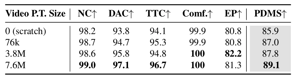 表3。缩放视频预训练改进了NAVSIM Navtest的规划。