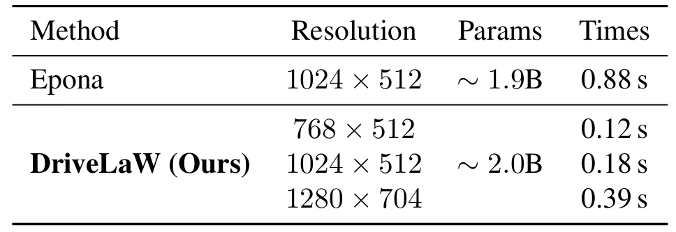 在单 NVIDIA 4090 GPU 上,DriveLaW 生成 1024×512 分辨率视频仅需 0.18s/帧,1280×704 分辨率也仅需 0.39s/帧,是 Epona(0.88s/帧)的 2 倍以上(表7)。