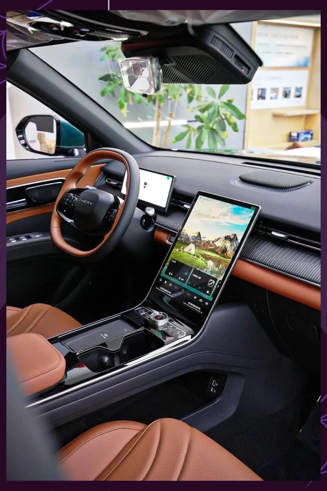 然后我们进来看一下内饰啊。这个内饰也是两种风格,虎款是悬浮式大屏,豹款是竖置大屏。我现在摸一下这个用料,这个软质材料包覆的面积还是挺大的,然后这个竖条纹的饰板,嗯,质感还可以,就是比老款那种毛坯房的感觉好太多了。