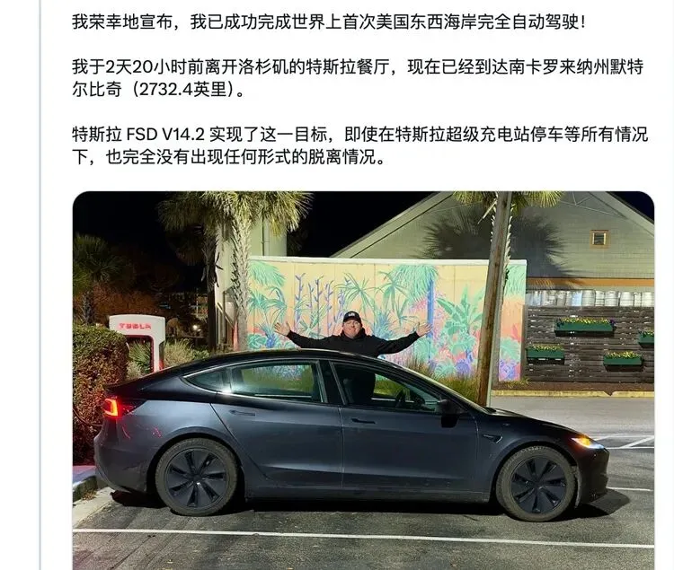 特斯拉FSD用一场4397公里的零干预行驶,给全球自动驾驶行业立下了新标杆。从美国西海岸洛杉矶到东海岸南卡罗来纳州,这辆特斯拉耗时2天20小时完成横穿,全程没有任何人工接管,甚至连进超充站充电都是自主完成。