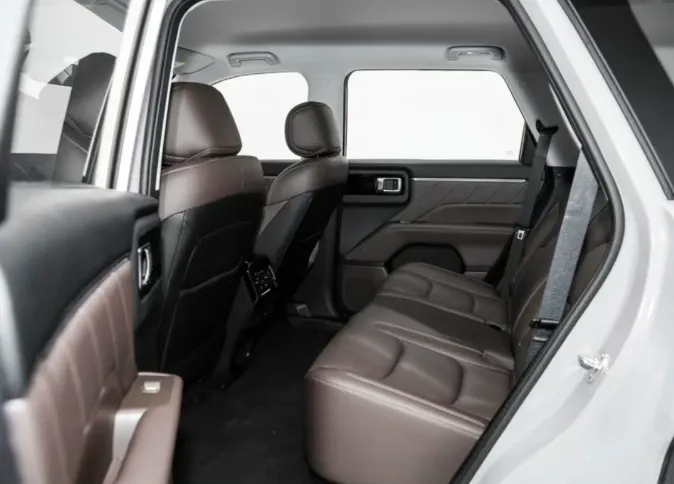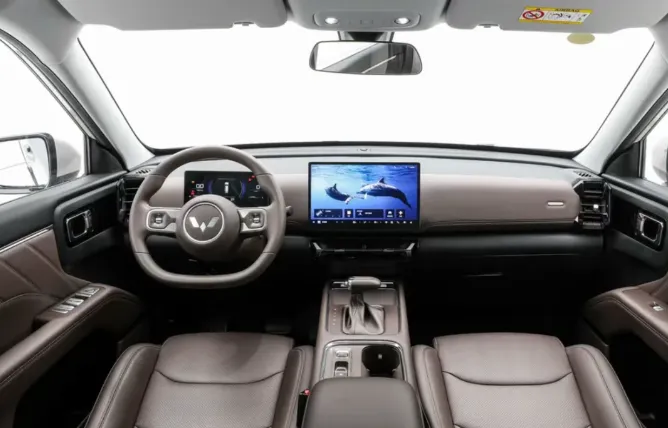 视线再往车里走,内饰给人的第一印象偏硬朗。中控台和门板大量使用直线和方正轮廓,风格更接近传统燃油SUV。皮革覆盖面积接近九成,触感和视觉都不显廉价,棕色内饰把家用和商务的气氛拉到一个中间位置,坐进去不会觉得浮夸。