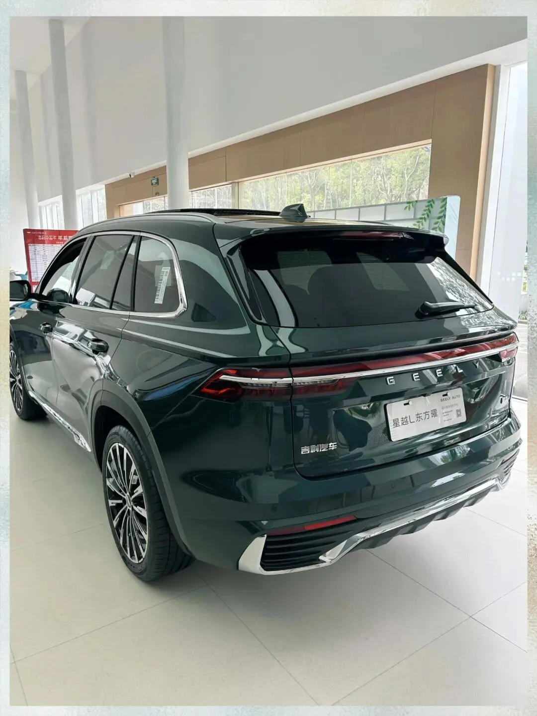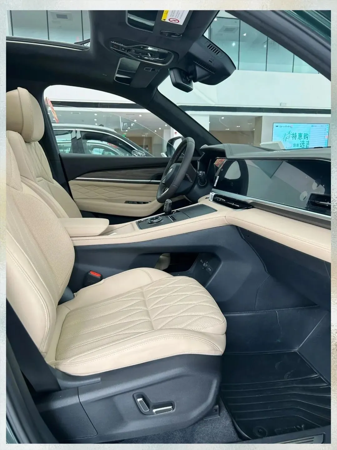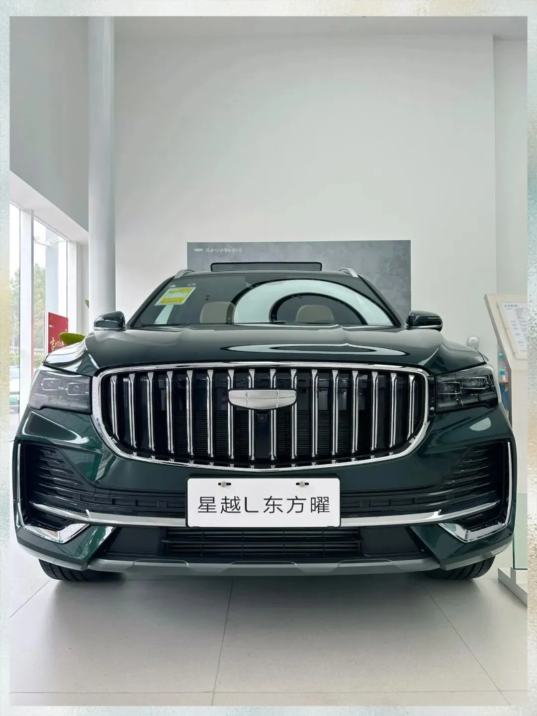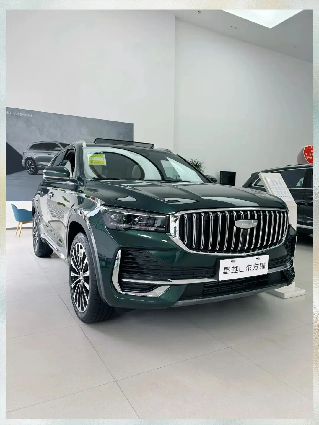坐进去之后,这个内饰我要说一下,三联屏这个东西吧,其实现在很多车都有,但是星越L这个它中控屏是往驾驶位这边倾斜的,大概十来度的样子,操作起来确实顺手一些。然后我用指甲敲了一下这个中控台的材质,软的,包覆面积也还行。