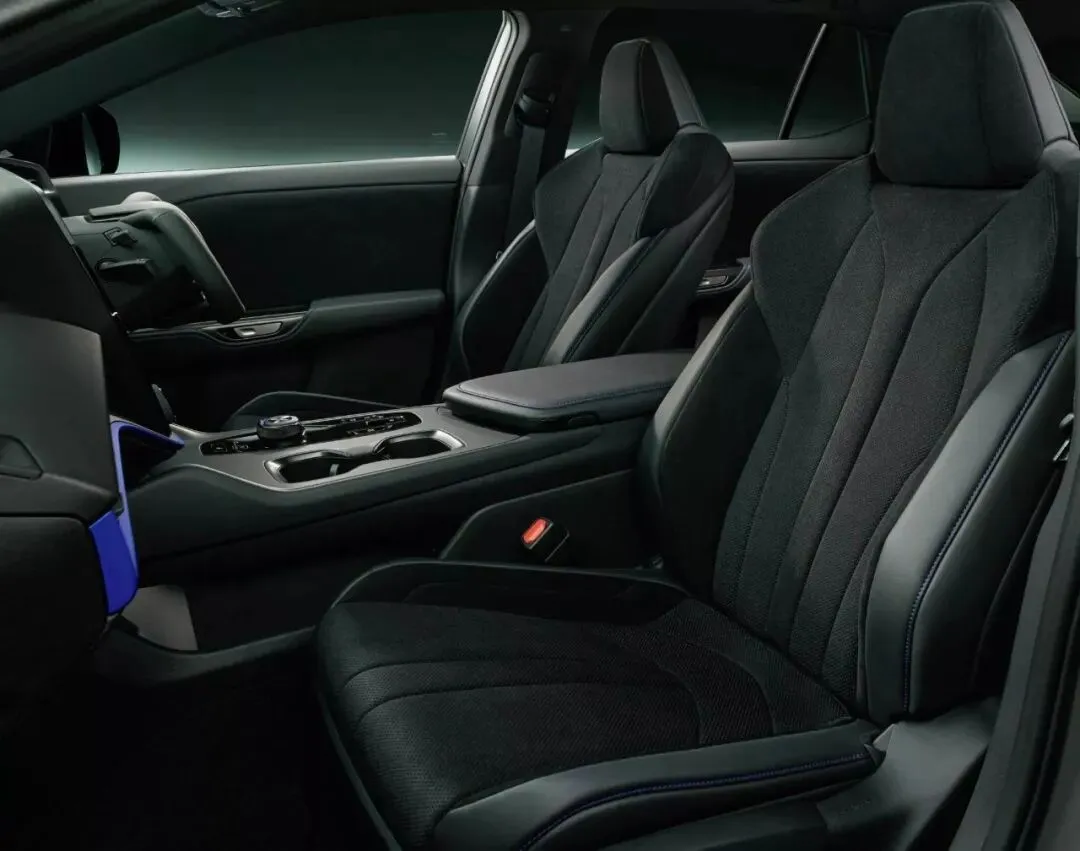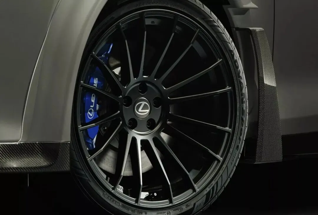 车身提供中微子灰与白银II两种配色,均以黑色为基底,搭配外露碳纤维材质与蓝色饰条点缀,配备21英寸哑光黑色Enkei合金轮毂,前轮搭载20英寸刹车盘与六活塞铝制一体式卡钳,悬架高度较RZ 550e F Sport降低20毫米。