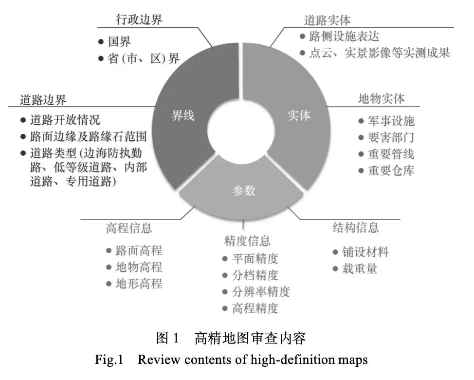 高精地图是高级辅助驾驶地图上的继承与延伸,通常为综合自动驾驶企业所应用。根据《高级辅助驾驶地图审查要求》(GB/T 44489—2024),高精地图需要审查的内容包括界线、实体和参数三个方面,如图1所示。