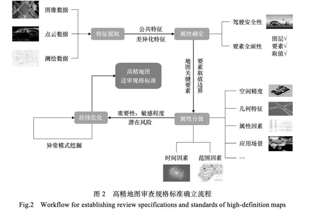 为提升高精地图审查效率,需要根据国家、部省(市、区)关于地图审查的有关文件和要求,建立高精地图数据审查规格标准,确定基本属性和重点审查属性,明确属性定义域与审查优先级,约束图层、属性命名及空间范围。图2展示了高精地图送审规格标准按照特征提取、属性确定、属性分级、持续优化的路线建立流程。