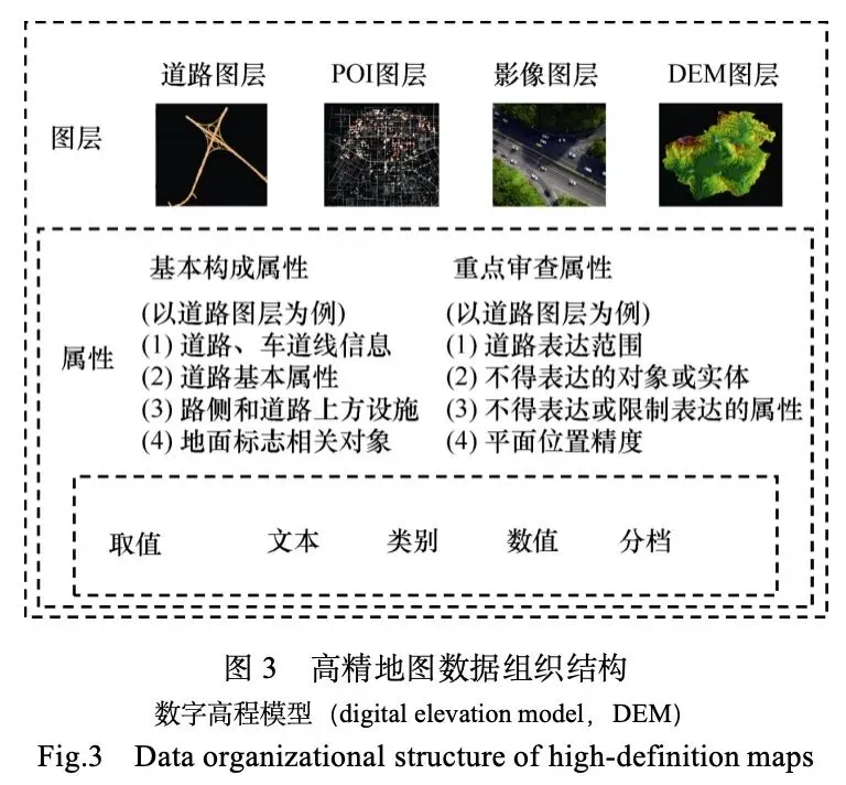 为适应自动化地图审查,提高审查效率与覆盖程度,接受审查的高精地图数据应严格按照图层–属性–取值的基础结构进行组织。如图3所示,待审查图层应为自动驾驶实践中直接使用的图层产品,主要包括道路图层、POI图层、影像图层、DEM图层,不包括点云等原始数据。