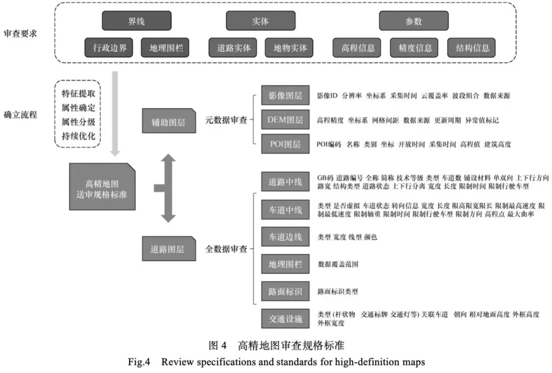 高精地图审查规格标准如图4所示。面向界线、实体、参数三方面审查要求,基于审查标准确立流程,建立辅助图层和道路图层的审查规格标准。