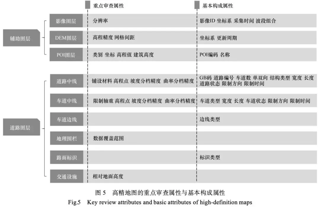确保高精地图数据可用性的基础道路属性,称为基本构成属性。涉及道路表达范围、禁止表达的对象或实体,以及禁止表达或限制表达的属性、平面位置精度等信息的敏感属性,称为重点审查属性。高精地图的重点审查属性与基本构成属性如图5所示。辅助图层的基本构成属性为各图层的元数据,重点审查属性包括时空分辨率和高程信息等。