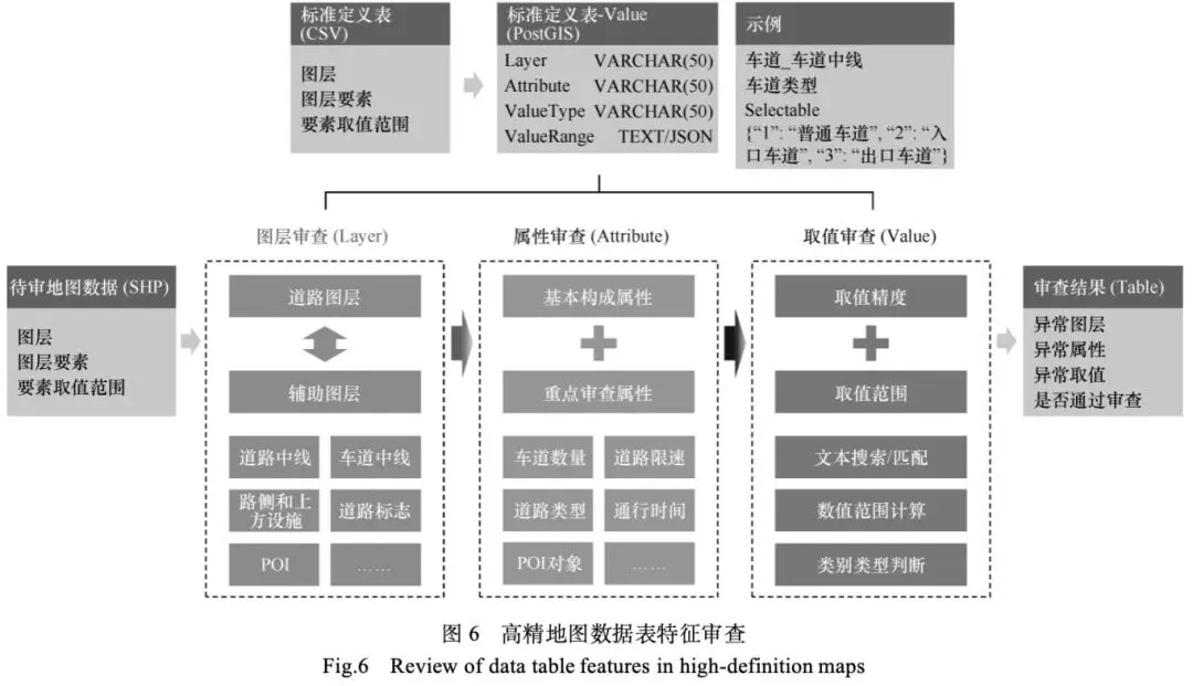 传统地图审查主要聚焦于几何形状、空间关系、分布规律与制图知识。为保障高精地图的丰度与鲜度,需进一步明确高精地图的审查内容与方法,构建全量审查、增量审查、动态更新管理相结合的快速审查机制。高精地图审查的重点是全量审查。全量审查分为地图的拓扑特征审查和数据表特征审查两方面。前者,重点审查道路边界的曲率连续性、车道线间距的均匀性,以及交叉路口连接拓扑的合理性,以确保地图数据几何特征符合现实道路工程规范;后者,按照高精地图审查规格标准,分为图层审查、属性审查、取值审查三个环节,如图6所示。
