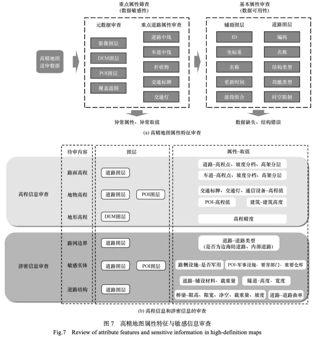 高精地图数据中敏感信息的审查,需要依次进行图层、属性、取值审查,以保障地理信息安全。对于高程信息,路面高程信息可能包含于道路、车道的属性,地物高程信息可能包含于交通设施的高程属性和建筑物、POI的高程值,地形高程信息可能存储于DEM图层;对于涉密信息,道路、路侧设施和POI的用途审查十分重要,且需要审查道路、桥梁和隧道的属性详细程度,尤其是影响通过性的重要参数,以判断数据表达是否合规,如图7(b)所示。