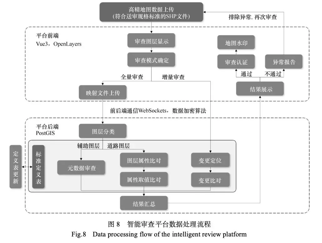 针对地图审查的相关要求,各地存在一定的差异。构建统一的智能审查平台,可兼容各地域、各层级审查标准,通过角色权限管理和模块化规则引擎,实现审查业务的无缝衔接。高精地图智能审查平台主要面向高精地图的数据表特征审查,功能包括地图上传、地图展示、映射文件上传、审查结果展示,基于Vue3、WebSocket、PostGIS搭建。