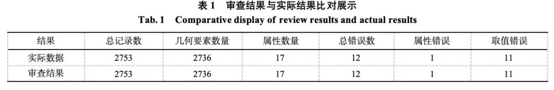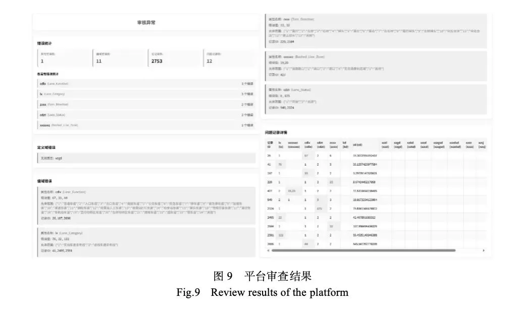实验以某实际路段数据为例,修改其中部分数据后进行审查。审查结果将统计总记录数、问题记录数、属性与值域的错误数,显示当前图层下各属性的错误数,展示定义域错误与值域错误,并列出每一条问题记录的详细参数,展示在平台前端页面。平台审查结果如图9所示。结合表1可知,未出现漏检、错检现象。这表明了审查平台的稳定性和可用性。