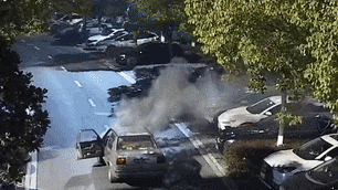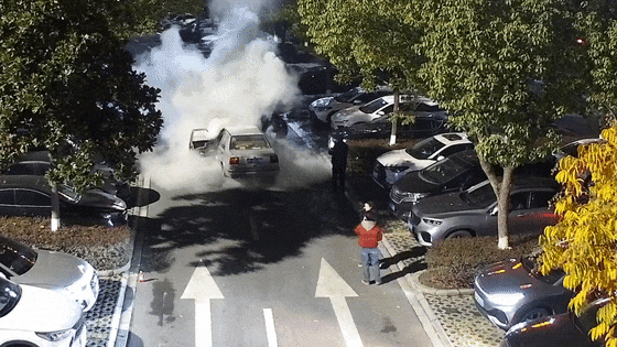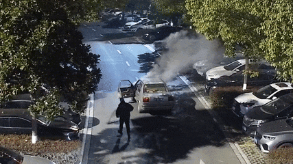 快步跑向起火车辆,尝试灭火
