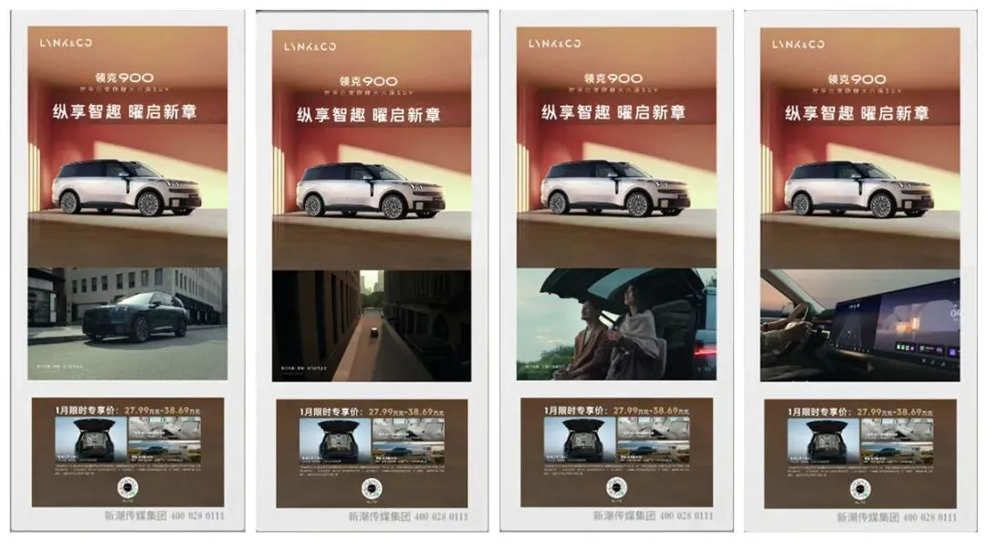 除了场景锁定之外,品牌声量的引爆需要依托高频次的信息渗透。电梯媒体的独特优势正在于无法回避的封闭环境与每天数百次的高频轮播。通过在新潮传媒电梯智能屏的持续广告投放,领克900的品牌信息在目标受众的日常生活动线中反复出现,形成“曝光效应”,不断强化用户对品牌的熟悉度与好感度,完成了从“让用户看见”到“让用户记住”再到“让用户认同”的心智渗透过程。