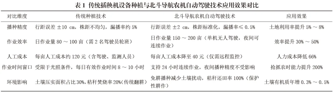 以德惠市江畔农牧专业合作社为例,2024年引入了北斗导航无人驾驶水稻插秧设备,为评估北斗导航农机自动驾驶技术应用效果,其中300亩水稻采用北斗导航无人驾驶技术,另外300亩采用了传统插秧机设备种植技术。其中北斗导航无人驾驶技术通过云端平台预设7条U形避障路径,绕行田埂后自动回归轨迹,漏插率≤0.5%[3]。土壤传感器实时反馈氮磷钾含量,变量施肥减少浪费。应用效果对比结果如表1所示。从中可知,相较于传统农机种植技术,应用北斗导航农机自动驾驶技术,播种精度更高,误差从±10 cm降至±2 cm。作业效率更快,提升了30%~50%,而且由于是自动化驾驶,且能够连续作业,因此整体的作业成本更低,作业窗口时间更长,更有利于提升水稻种植生产综合效益。江畔农牧专业合作社北斗导航模块单价约2万元,较传统农机增加10%,但实际维护成本有所降低。德惠市自2020年起实施秸秆禁烧政策,北斗技术通过秸秆覆盖条耕能够满足合规要求。