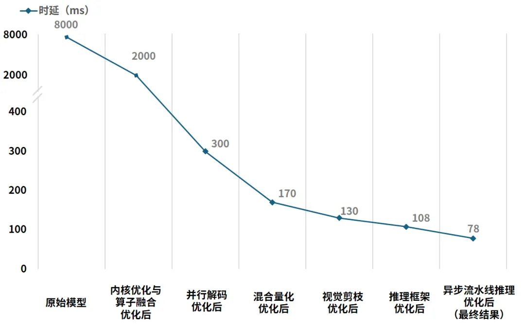算子融合与混合量化:实施异构精度策略,针对视觉Transformer实施 INT8 PTQ量化,在保持高分辨率感知精度的同时显著提升吞吐;对语言内核采用W4A16量化,突破访存带宽瓶颈。同时,针对Transformer网络进行深度算子融合与加速,并将部分网络高频操作前移至预处理阶段,彻底消除推理过程中的冗余计算。