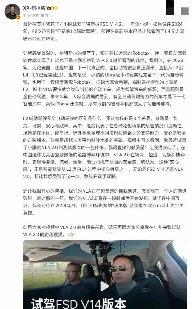 2026年,你开车睡觉都能到公司?何小鹏刚试完特斯拉FSD,直接拍板:L3?早该扔了!