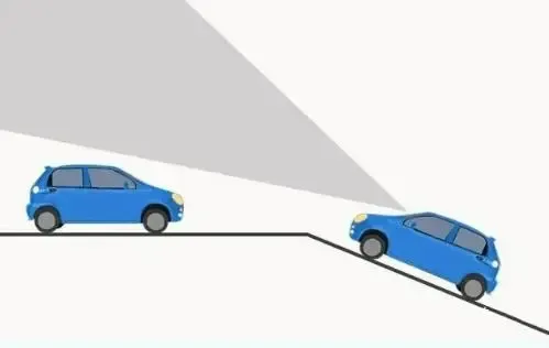 上下坡时:车辆在上坡时,会与坡面形成夹角,出现视野盲区,可能无法发现对向车辆及坡道上的其他障碍物。坡上的车辆在下坡时,也可能遇到此类情况。