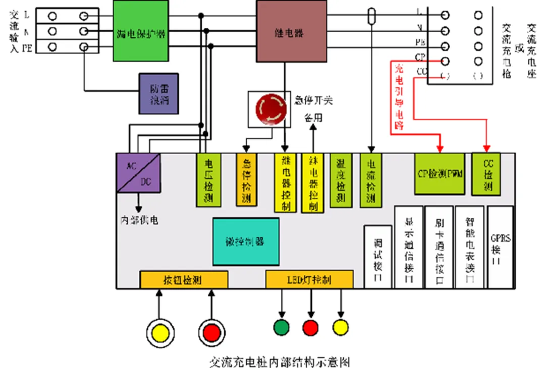 主回路包含输入保护断路器、交流智能电表、交流控制接触器和充电接口连接器。