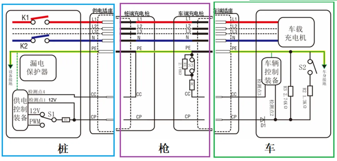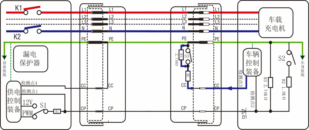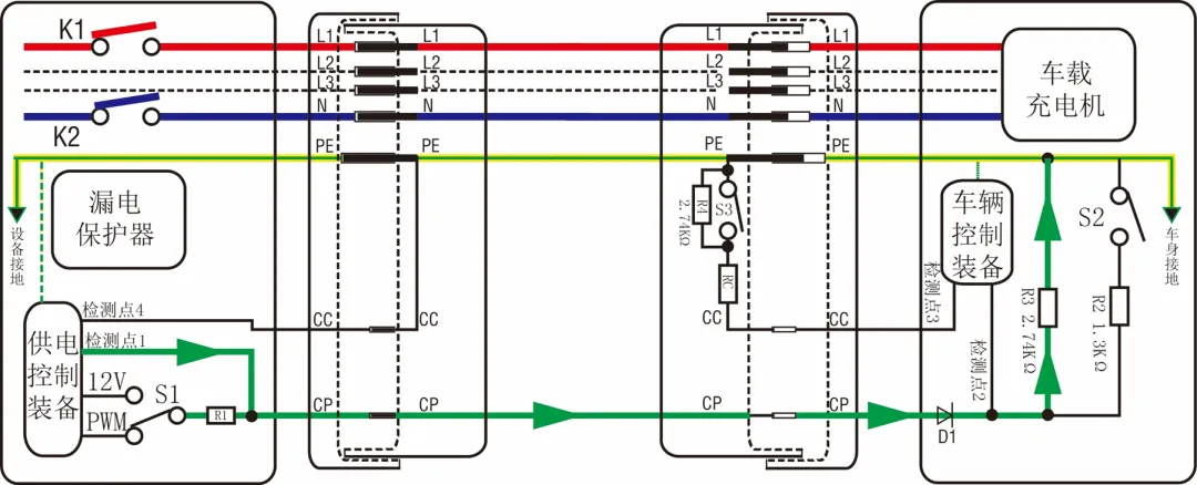充电桩端连接完毕,车辆端充电枪连接CC ,CP端子接触,检测点1的电压由12V变为9V,充电桩检测到充电枪已连接。