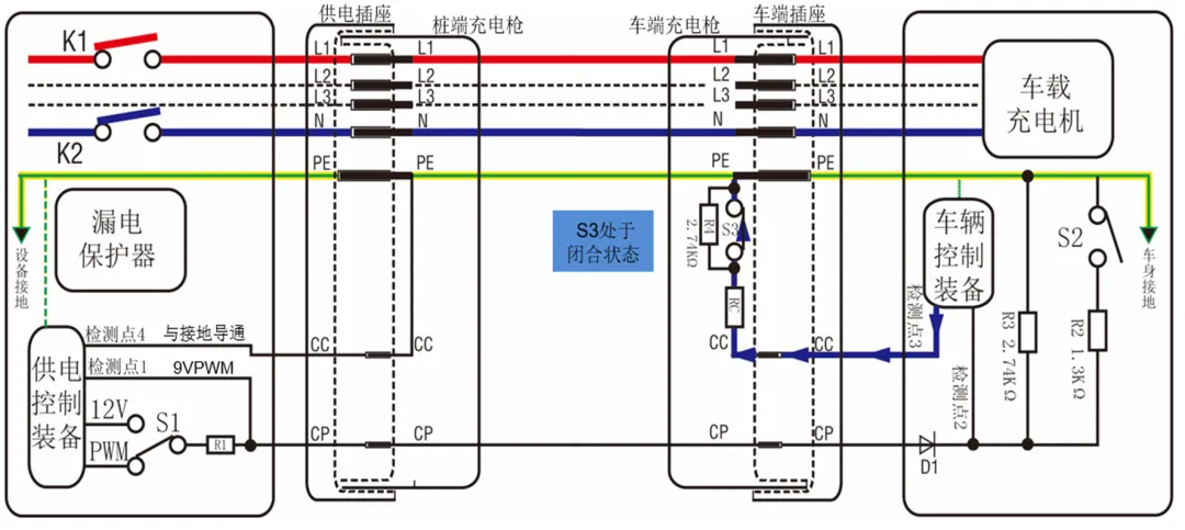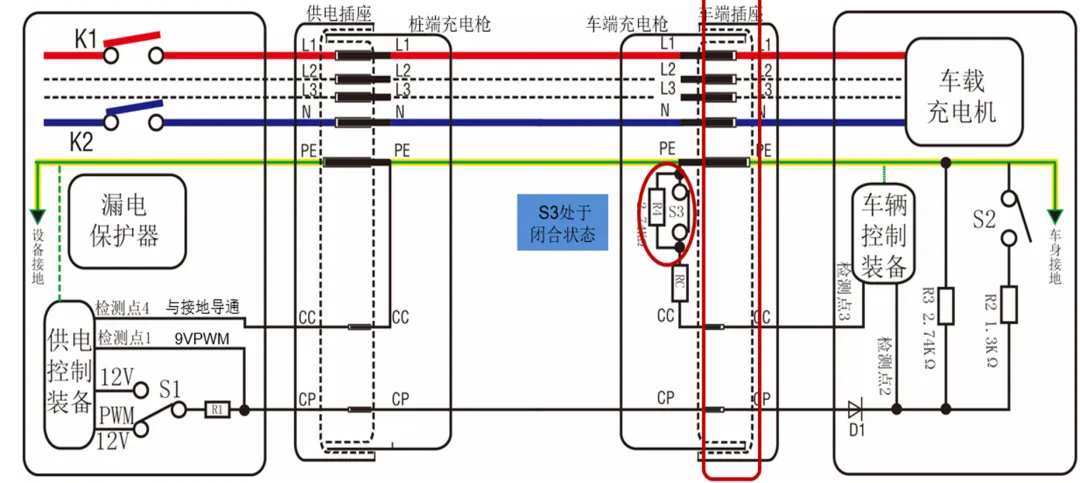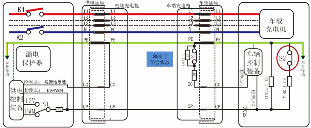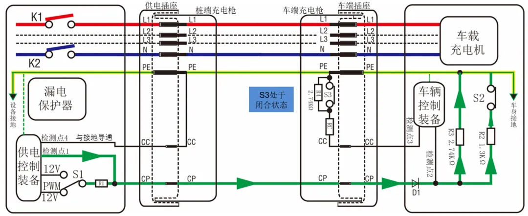 车辆端充电枪连接完毕,S3开关(车端充电枪解锁按键弹起)闭合。